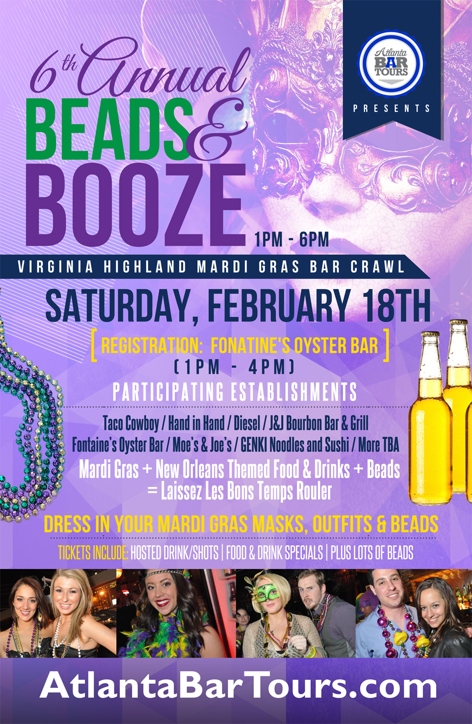 Come dressed in your best BEADS and BOOZE like you're in THE BIG EASY! This is the biggest Mardi Gras themed bar crawl in Virginia Highland! Ticket includes a New Orleans themed comp shots, 3/2/1 drink specials, beads, New Orleans themed food specials, DJs and more.